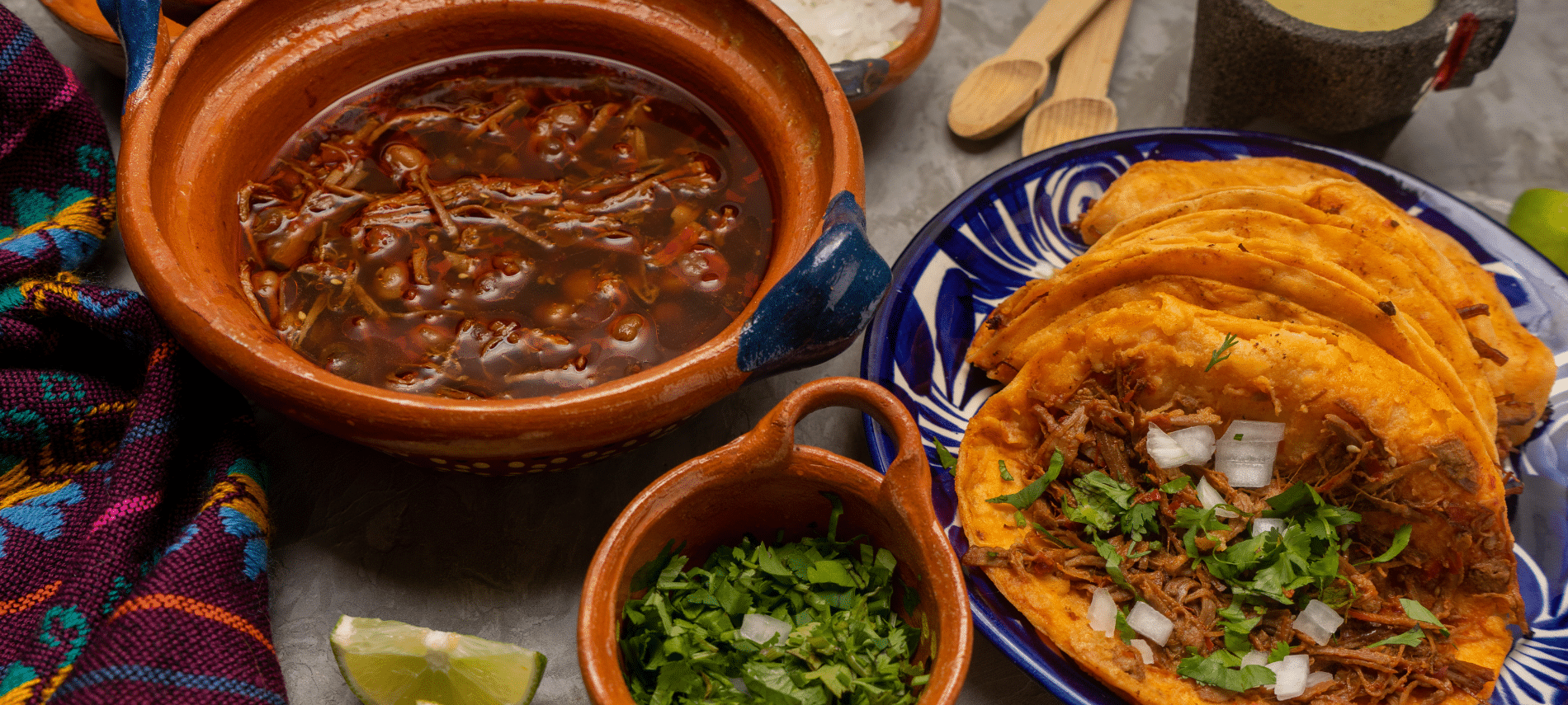 birria tacos served with rich consommé chopped onions cilantro lime and traditional mexican accompaniments